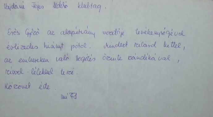 Győzőről annyit tudok elmondani, hogy „lakva ismerszik meg az ember”. Egy olyan embert ismertem meg, aki képes átölelni az egész világot.